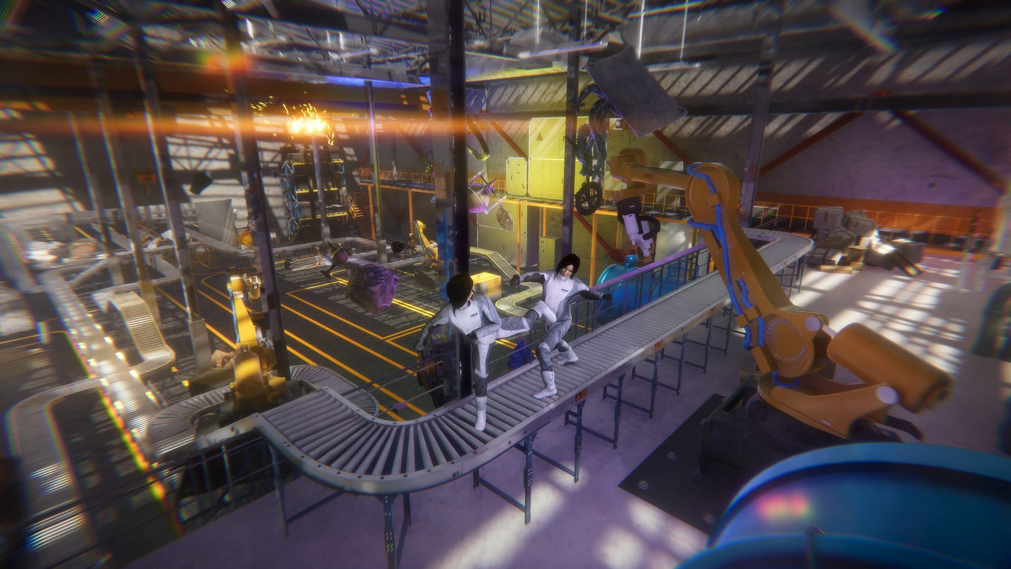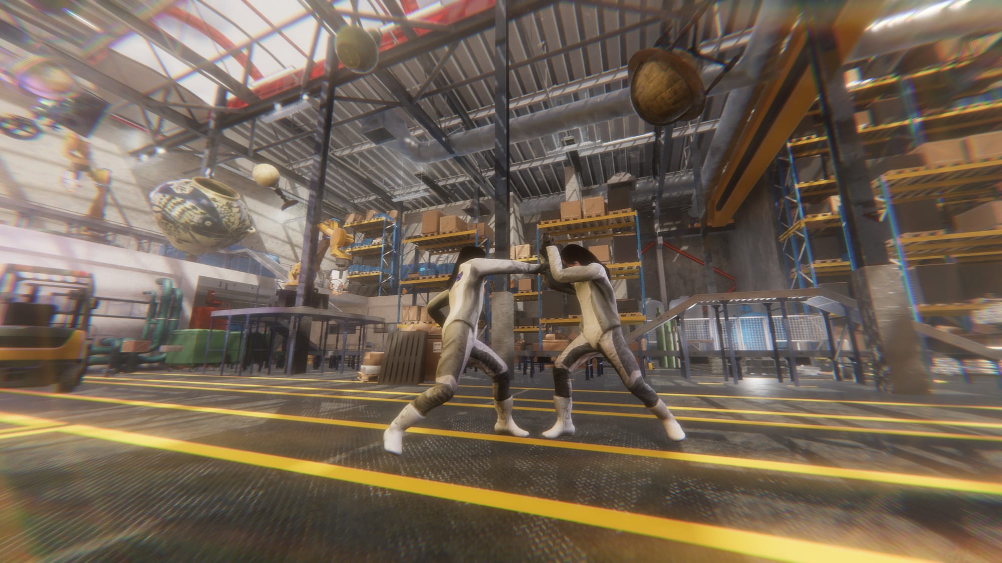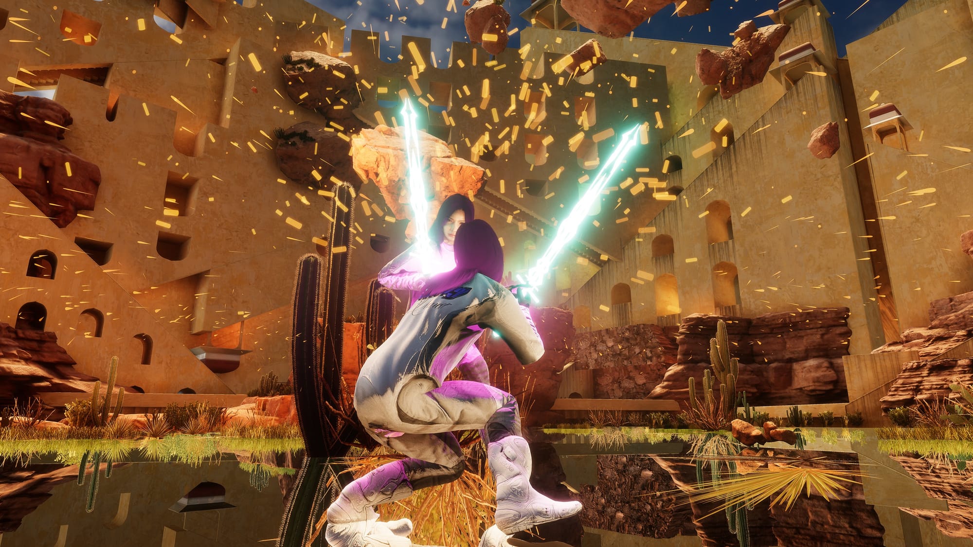 Actualizing this question of embodiment, Kim's Performa Commission places two performers—working in tandem with a choreographer—at the center of a stage apparatus that generates live motion-capture data. Their movements animate not only human avatars on a screen but also non-human digital props such as bicycles, ladders, and other speculative forms. These data streams are projected into game engine-built worlds that Kim and her team have been developing for years: a dense city center, a desert expanse, the interior of a fulfillment center. As the performers navigate both the physical venue and the digital—their bodies duplicated and displaced, refracted through layers of code—the line between virtuality and reality collapses into something far less unstable: a choreography of conjecture, estrangement, and uncanny recognition.