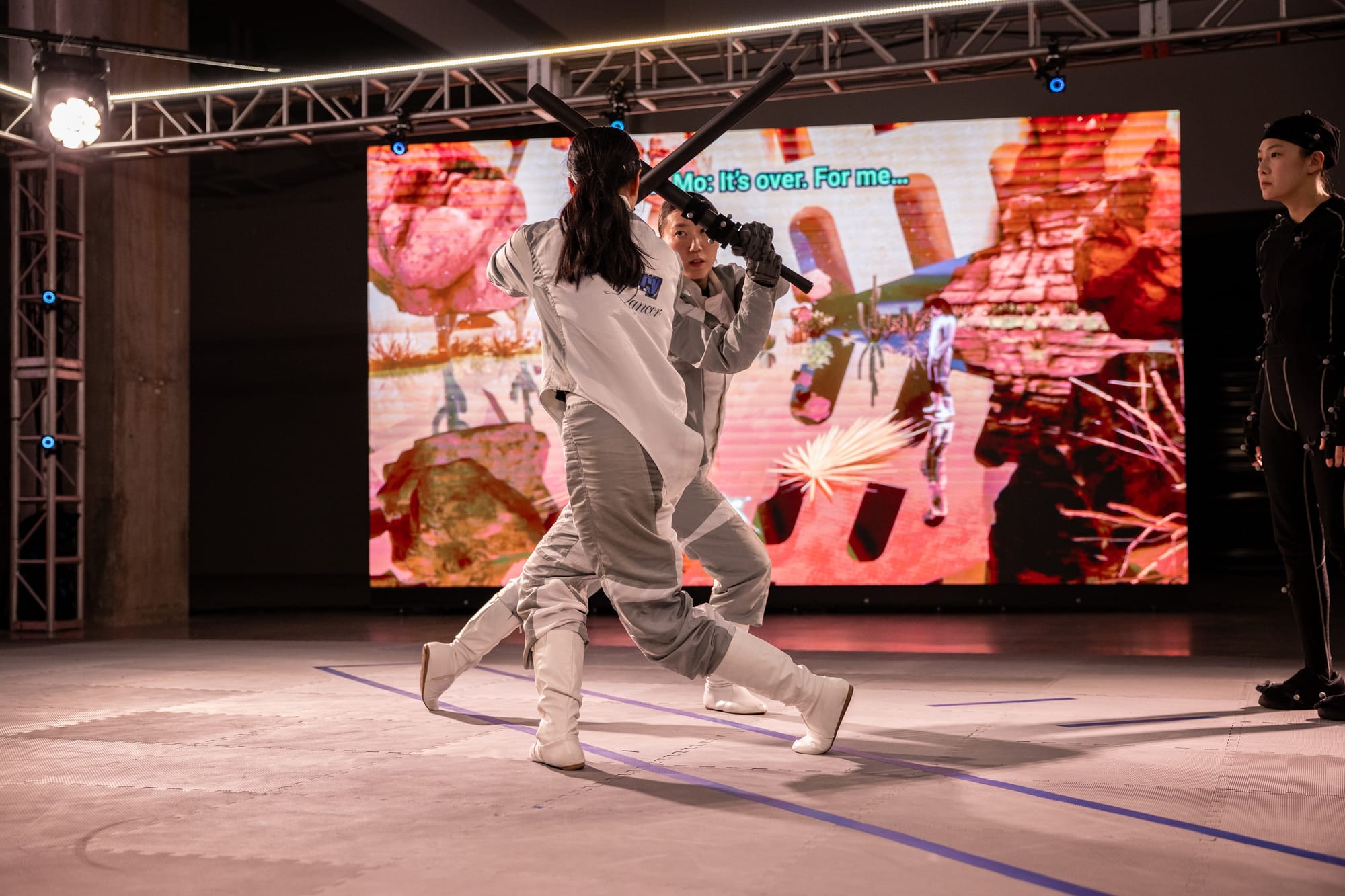 For the movement vocabulary and scenography, Kim draws on the aesthetics of video games, martial arts, and "Girls’ Love"—a comic genre centered on female-to-female romantic relationships—to probe the recursive loop of doubling and substitution in contemporary image-making. While "Girls’ Love" often depicts intimacy and emotional ties between women, Kim engages the genre not to reproduce its narratives, but to borrow its sensibility as a lens for imagining alternative relations and worlds. In this sense, "Girls’ Love" functions less as a fixed genre reference than a cultural resource, resonating with her interest in repetition, multiplicity, and speculative storytelling.